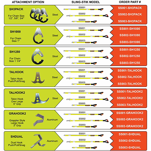 The Sling-Stik's design allows the you to change hook attachments. You can loosen the 3/8 stainless steel cap screw with the provided 5/16 inch allen wrench and swap out hook attachments in seconds. You can choose one hook attachment option when you purchase your Sling-Stik. Add another hook attachment by purchasing them separately.